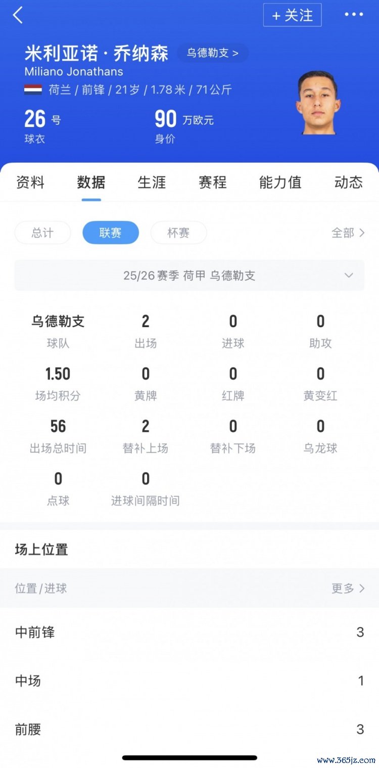 米利亚诺-乔纳森,出道于维特斯青训,今年1月转会到乌德勒支效力,本赛季出战了6场赛事 ,上赛季他在乌德勒支B队和一线队的31场赛事 中打入11球另有4助功 。目前球员德回转 价90万欧。