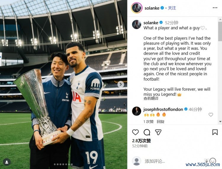 8月4日讯 热刺领队 孙兴慜确定离队,韩国人预计将加盟洛杉矶FC。在社交媒体上,孙兴慜的锋线搭档索兰克进行了告别。