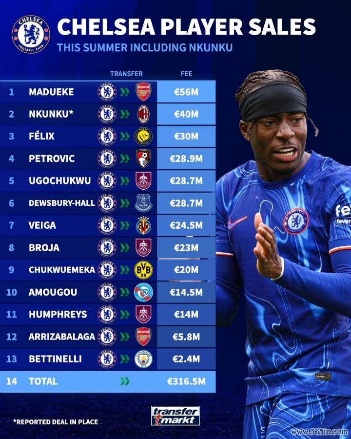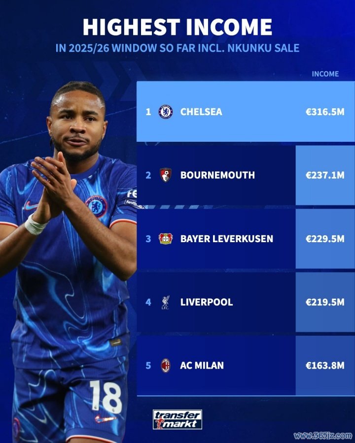 08月28日讯 据多家媒体消息,恩昆库即将以超过4000万欧元转会费加盟米兰,据德转统计, 排球资讯直播平台切尔西今夏卖人总收入将达到3.165亿欧元, 足球快讯冠绝全欧,西甲比卖人榜第二位的伯恩茅斯多了近8000万欧元。