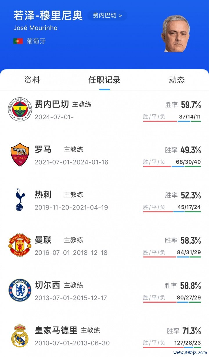 穆里尼奥2024年6月出任费内巴切主帅,西甲带队战绩为37胜14平11负。