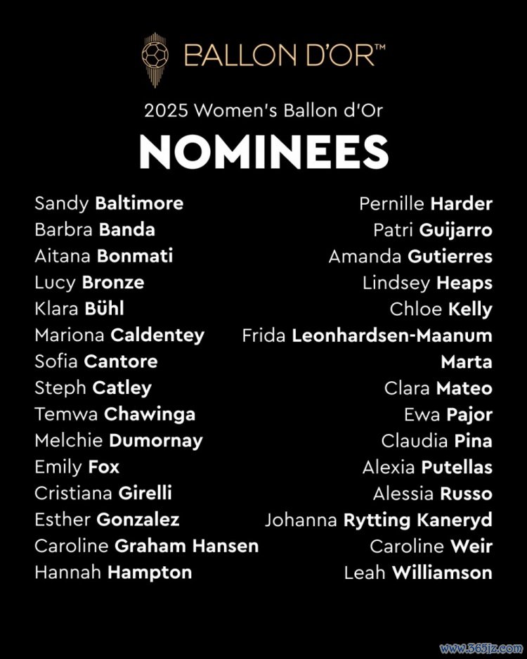 普特拉斯(巴萨/西班牙)、汉娜-汉普顿(切尔西/英格兰)、芭芭拉-班达(里昂/赞比亚)、艾米丽-福克斯(阿森纳/美国)、克拉拉-马特奥(巴黎FC/法国)