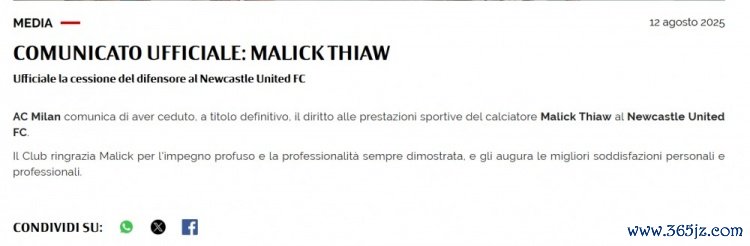 8月13日讯 米兰官方发表公告,确认佳夫转会加盟纽卡斯尔联。