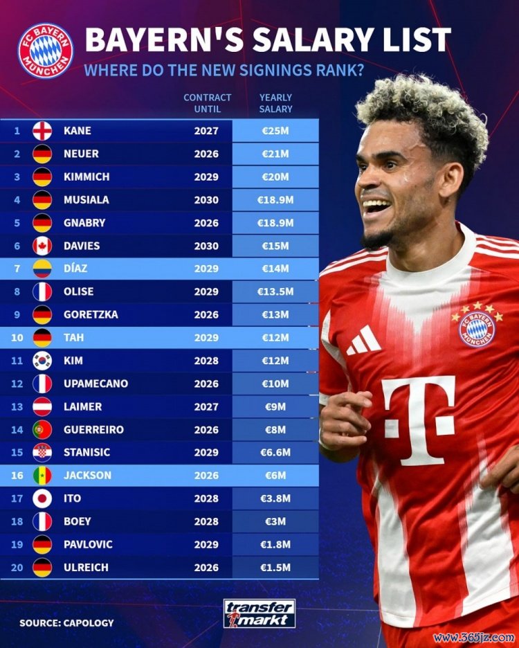 德转列拜仁年薪:凯恩2500万欧居首,迪亚斯1400万、杰克逊600万