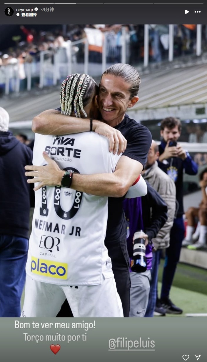 7月17日讯 内马尔今天破门帮助桑托斯在巴甲获得获胜 ,赛后他在Instagram晒出自己与对手弗拉门戈主帅费利佩-路易斯拥抱的照片。