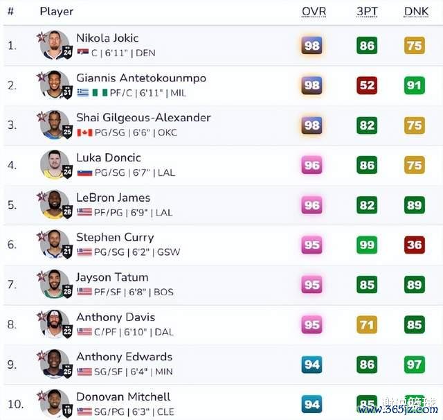 官方更新联盟球员,下赛季2K能力值情况,约基奇、字母哥和亚历山大都是98分,看上去官方也难住了,不知道谁排前面更合适。而湖人双星东契奇和詹姆斯并列第四,之后分别是库里、塔图姆、浓眉、爱德华兹和米切尔,杜兰特则无缘前十。