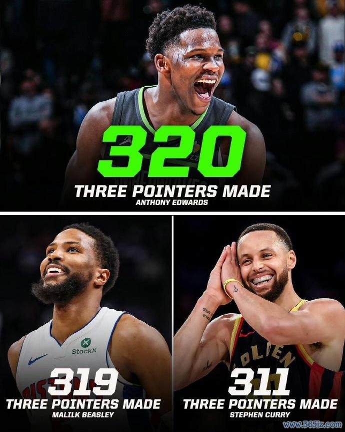 上赛季三分王的角逐 也十分剧烈 ,直到常规赛最后一场赛事 才尘埃落定。爱德华兹最早命中320记三分,刚好比比斯利多命中了一记。库里也命中了311记三分,和前两名的差距非常小,要是多打几场就能再次成为三分王。