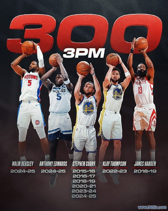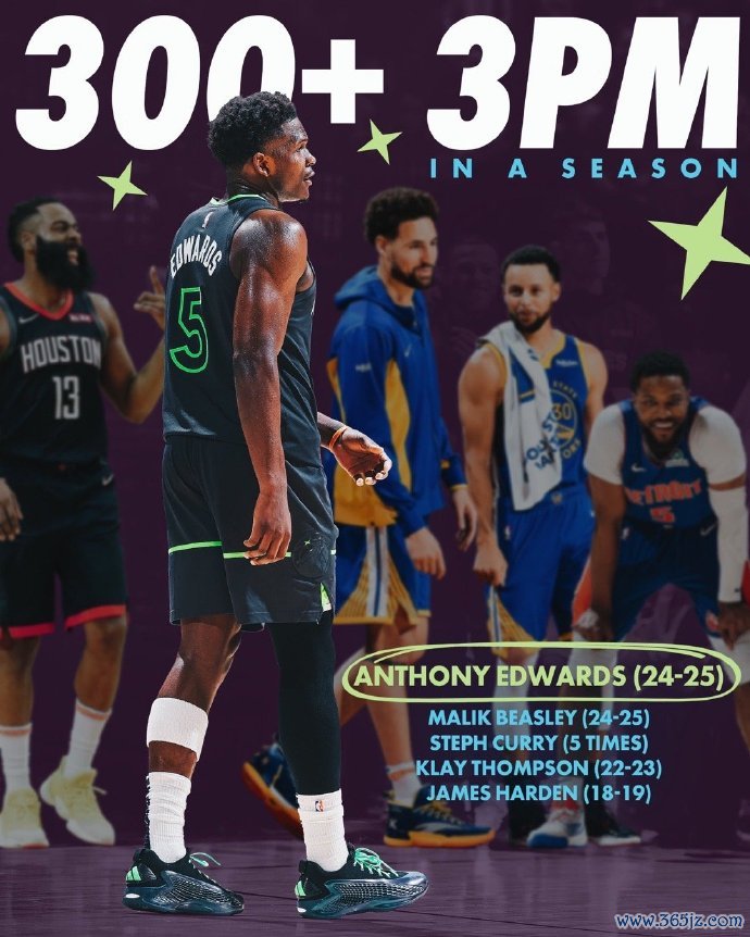 上赛季全联盟有多达3位球员命中超过300记三分,分别是爱德华兹、比斯利、库里新浪NBA手机网,这也是历史上首次出现这样的情况。在此之前,能单赛季命中超过300记三分的球员也只有库里(5次)、哈登、汤普森。