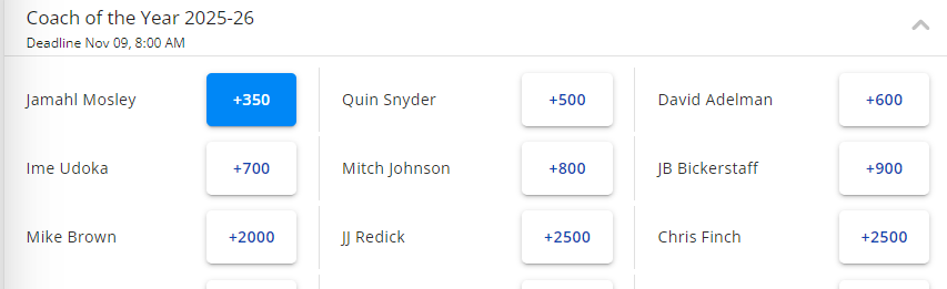 魔术主帅莫斯利(+350)最被看好,今年休赛期魔术引进贝恩,阵形 实力有所提升。随后是老鹰主帅斯奈德(+500)、掘金主帅大卫-阿德尔曼(+600)和火箭主帅乌度卡(+700),这三队也是休赛期明显有所补强的球队。