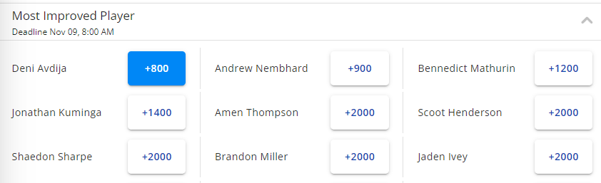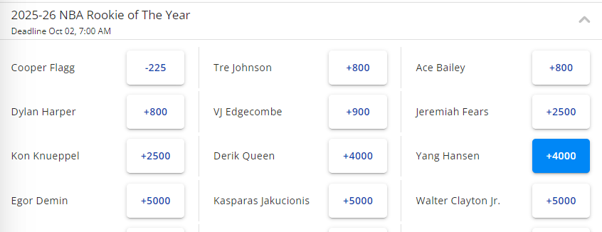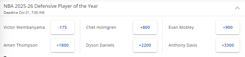 杨瀚森的队友阿弗迪亚(+800)是头号热门,但领跑 不明显。内姆布哈德(+900)排在第二,马瑟林(+1200)位居第三,哈利伯顿的赛季报销让他们两人可能数据暴涨。随后是库明加(+1400),以及同为+2000的阿门-汤普森、亨德森、夏普、布兰登-米勒和艾维。