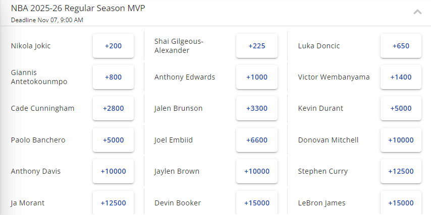 排在第11位及以后的有:恩比德(+6600)、米切尔、浓眉、杰伦-布朗(同为+10000)、库里和莫兰特(同为+12500)、布克和詹姆斯(同为+15000)。