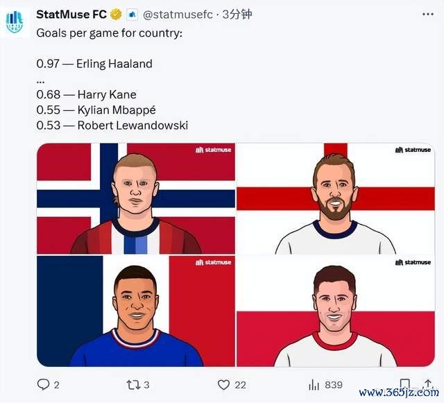 哈兰德早已成为挪威队史头号射手,而且为国家队出场44次打进43球,还有4次助功 ,场均得分 高达0.97个,足球直播比凯恩、姆巴佩和莱万多夫斯基都要高。值得一提的是,姆巴佩为法国出场90次轰入50球,场均打进0.55球,效率同样不低,但依然不如哈兰德。