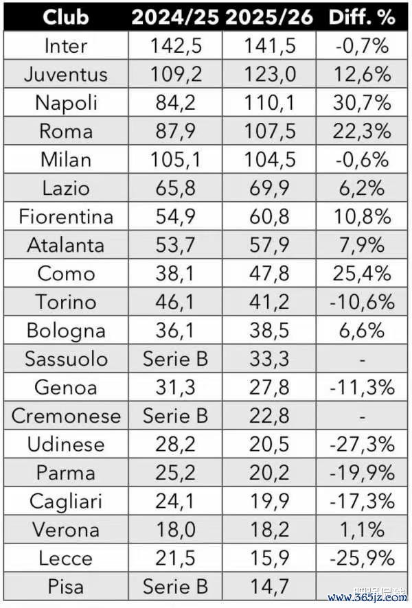 跟上赛季相比,国米的薪资微降0.7%,基本是持平竞技状态 。这主要是由于国米通过转会操作,清理了科雷亚、塔雷米、阿瑙托维奇等薪资成本较高的球员,而引进的多名新援薪资控制到位,避免了整体薪资成本的继续攀升。相比较而言,其他强队的整体薪资成本都有不同程度的增长,其中那不勒斯30.7%的涨幅最大,增速第二快的球队比较特殊,是今年夏窗引援力度巨大的科莫,罗马、尤文、佛罗伦萨、亚特兰大等球队薪资增幅都超过了10%!