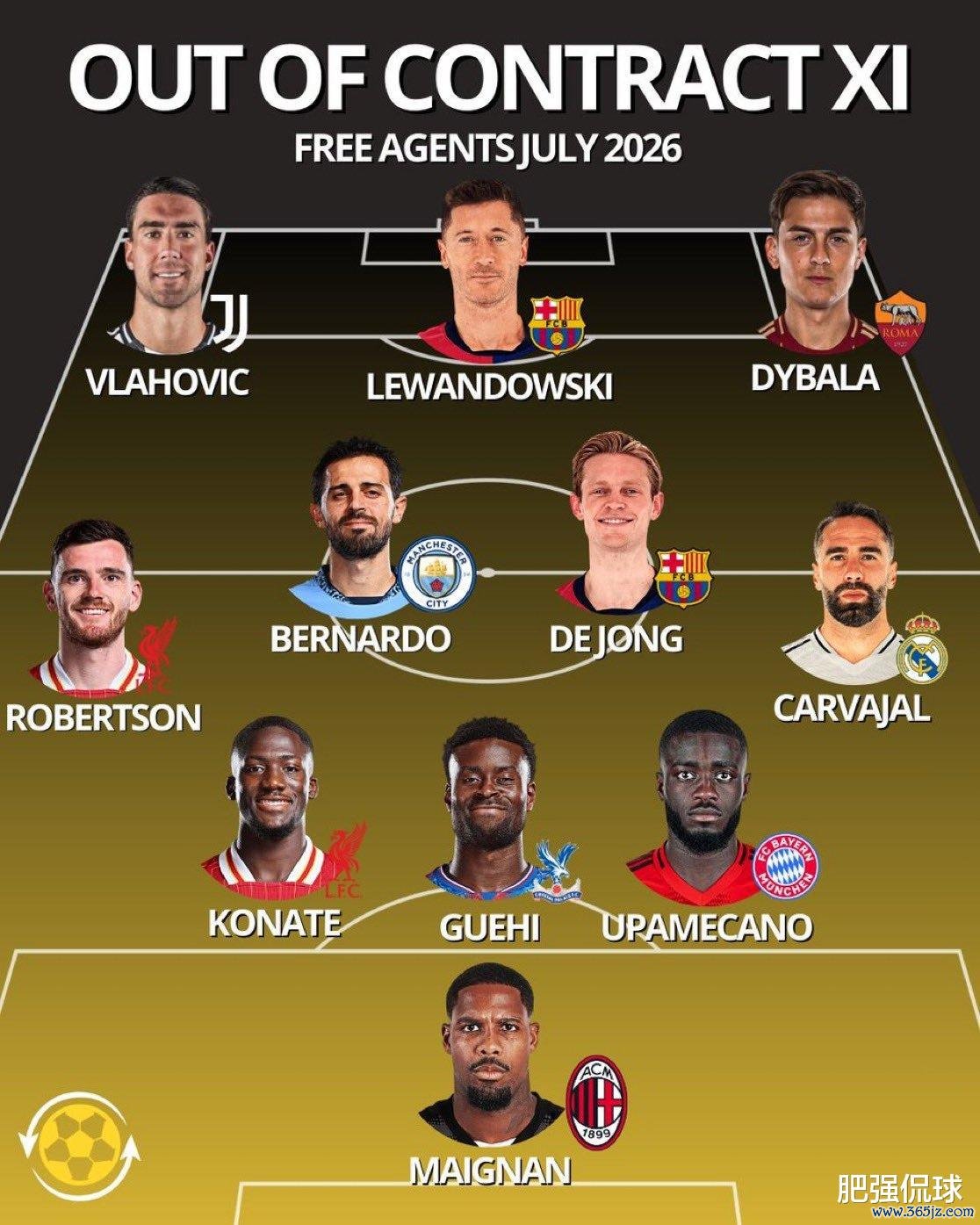 弗拉霍维奇不是明年夏窗唯一具备免签价值的球员,根据外媒统计的一份2026年夏窗最具免签价值阵形 中,基本都是欧洲足坛各个位置都排得上号的。