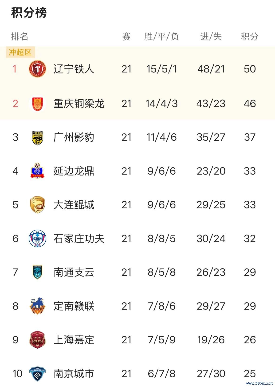 最终,大连鲲城以2:1击败了定南赣联队。这样中甲职业联赛 就结束了21轮的所有赛事 。我们先看21轮后中甲最新最全积分榜。