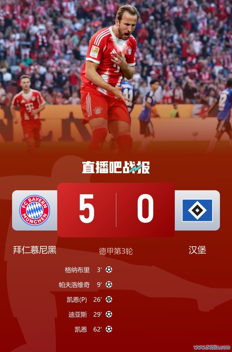 三连胜领跑!拜仁5-0大胜汉堡凯恩2射1传汉堡3场不胜