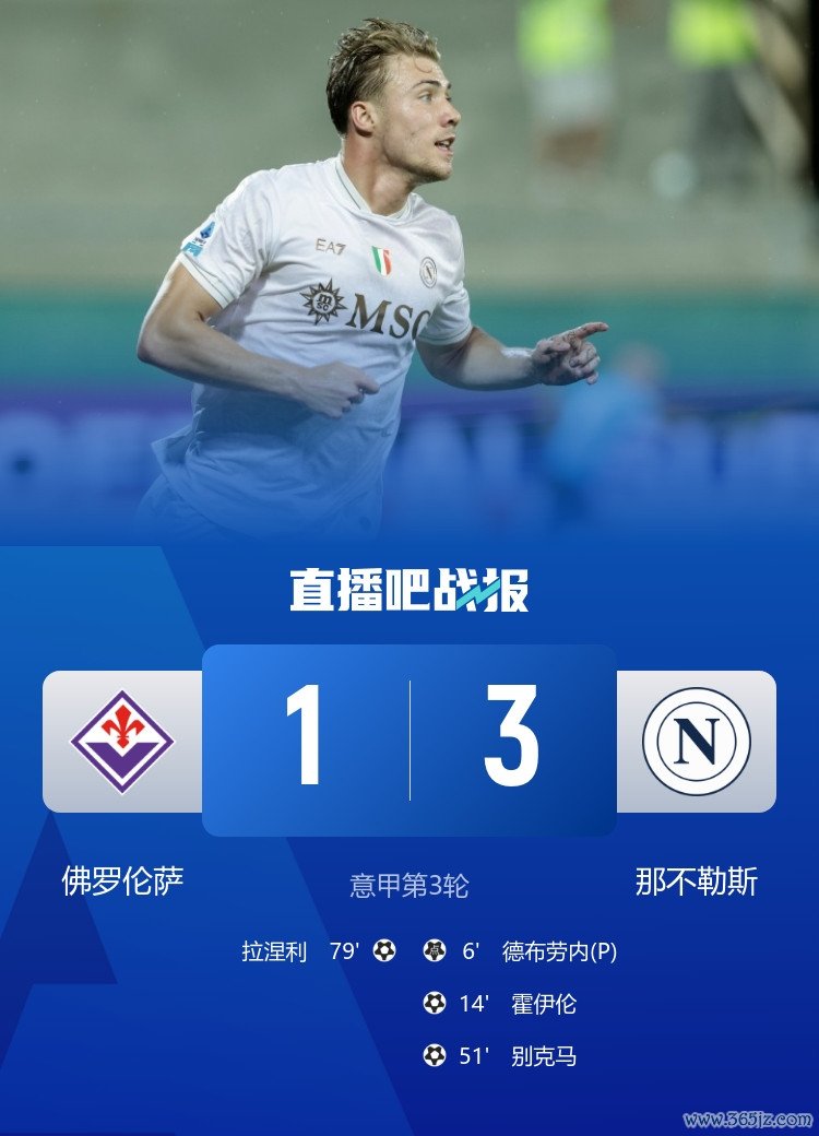 霍伊伦首秀破门!那不勒斯3-1佛罗伦萨领跑德布劳内点射建功