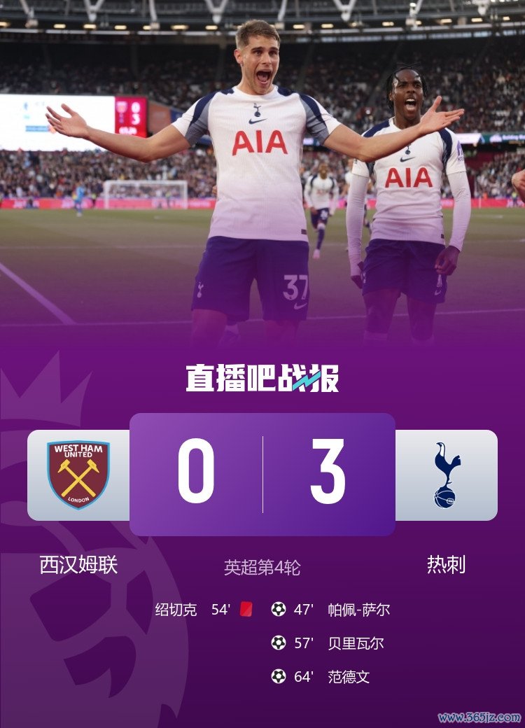 热刺3-0十人西汉姆联贝里瓦尔传射绍切克染红铁锤帮4轮狂丢11球