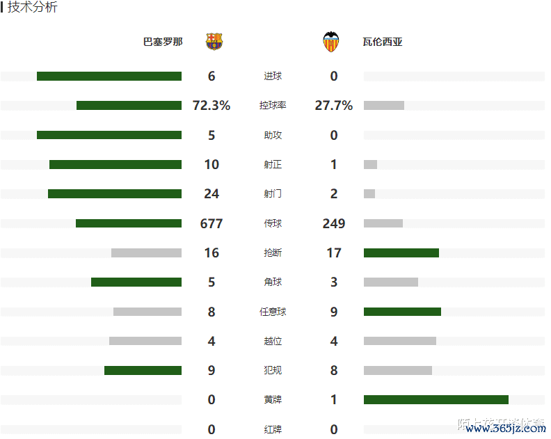 士气大振的巴萨,在第57分钟锁定胜局,为球队首开记录 的费尔明,大危险区域 前沿轰出一记世界波,再次攻破了瓦伦西亚守门员的十指关,彻底终结了胜负的悬念,比分来到了3-0,第66分钟拉菲尼亚再次破门上演连进两球,将比分改写为了4-0,后备 登场的莱万,最后时刻也连进2球,将全场比分定格为了6-0。