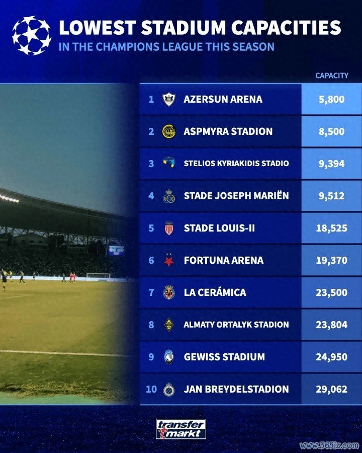 本赛季欧冠容量最小运动活动 场 排名: 卡拉巴赫主场作战 5800人居首