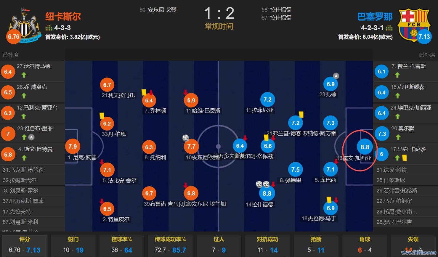 欧冠职业联赛 阶段第一轮的18场赛事 已经全部战罢,对我而言觉得最好看的一场赛事 就是纽卡斯尔1-2不敌巴萨,这是一场力量PK技术的经典赛事 。虽然巴萨赢球了,但上半场非常狼狈,是巴萨这位24岁的西班牙守门员霍安-加西亚的出色 抢救 避免了巴萨半场就被打花,下半场凭借着拉什福德的双响+世界波破门艰难拿下纽卡斯尔。