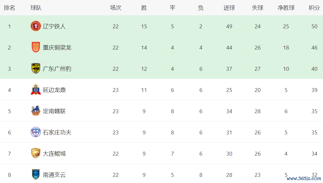 在积分榜上旧版球探,辽宁铁人以50分高居榜首。重庆铜梁龙以46分紧随其后。前2只有4分的差距。广东广州豹排名第3,拿到40分。广东广州豹就追赶 榜首比较多了,足足有10分的差距。延边龙鼎以39分排名第4。定南赣联35分排名第5。石家庄功夫也是35分,排名第6。