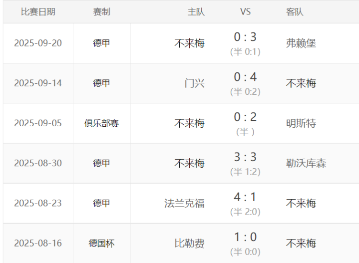 这支不来梅德甲开赛以来打的最“漂亮”一战是4:0战胜门兴,结果用力过猛下一场就虚了,主场作战 0:3被打回原形。还有一场经典的剧本,当时主场作战 两驱逐 9打11,1:3追赶 的情况下3:3绝平勒沃库森,直接把对面勒沃库森主指导教练员滕哈赫赛后给弄下课了,轰动一时。妥妥的神经刀本色!!